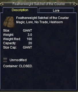 Note: If all you want is the big bag for the other characters on your account (on the server), once you have completed this quest round, put the bag in a shared bank slot, switch to another character, remove it from the shared bank, go back to the character that ran the quest, and hail Lysric. You can repeat this until all the characters have the bag.