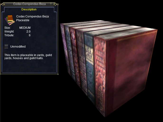 The group screenshots are each collection reward set. A female human rogue provides a sizing comparison for the item's default size. Very large items (trees and rocks) are repeated sized to as small as they can be made. Some items are also shown in an alternate view (i.e. table tops). Lower on the page are screenshots for individual items with their names.